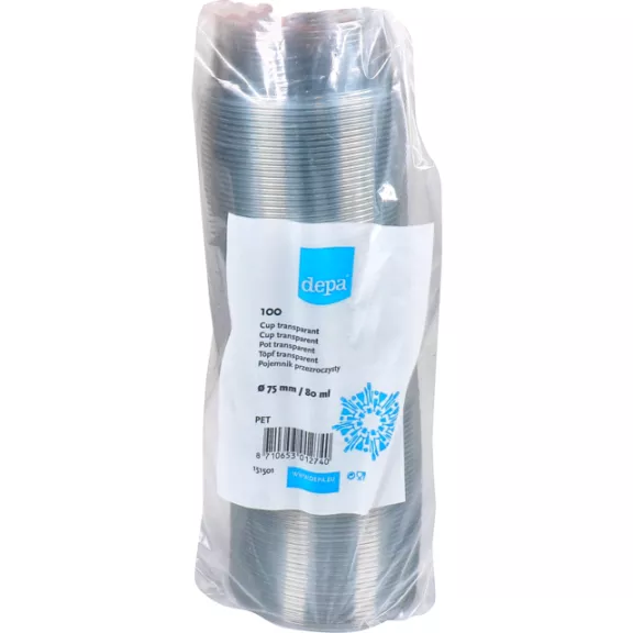 These transparent sauce cups are part of a series of three with different capacities (50 ml, 80 ml and 100 ml). The cups are the same size and differ only in height, making them perfectly stackable. Order all three sizes plus the universal, transparent lid (available separately) and you have a range of versatile sauce cups available for all kinds of purposes.